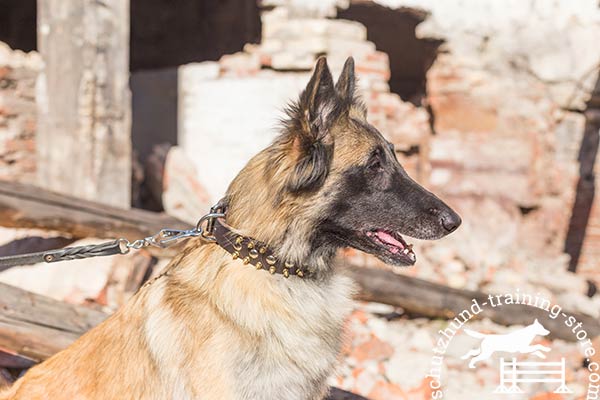 Tervuren brown leather collar adjustable decorated with spikes and studs for professional use